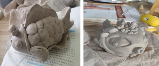 目前,针对各年级的陶艺教学正有序推进,并已取得初步成果。学前教育专业大三同学们已完成以“鱼”为主题的泥球成型项目创作。大家巧妙运用所学技法,创作出了包括河豚、海豚、鲨鱼在内的各式海洋生物造型,作品生动有趣,富有想象力。下一阶段,同学们将为自己的作品进行上色和施釉,经历窑火的淬炼,最终完成这些充满生命力的艺术创作。婴幼儿托育服务与管理专业的大二同学们已完成了基础陶艺知识的学习,熟悉了各种陶艺工具和设备的安全操作规范,并对拉坯技法的理论知识进行了预先学习,为即将开始的实际上手操作做好了充分准备。