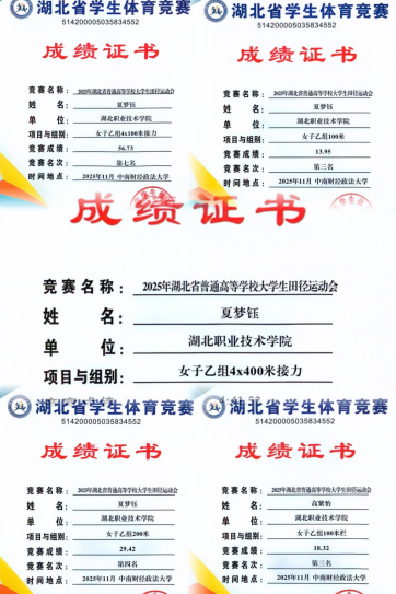 近日,从2025年湖北省普通高等学校田径运动会赛场传来喜讯,我校田径队凭借出色的表现,荣获乙组团体总分第三名的优异成绩,其中女子团体总分更是高居第二名,展现了湖职学子昂扬的拼搏精神。在此次比赛中,我院夏梦钰(辅导员:钟存学)、高紫怡(辅导员:张晓菡)两位同学奋勇争先,为学校和我院赢得了荣誉,特此报喜!
